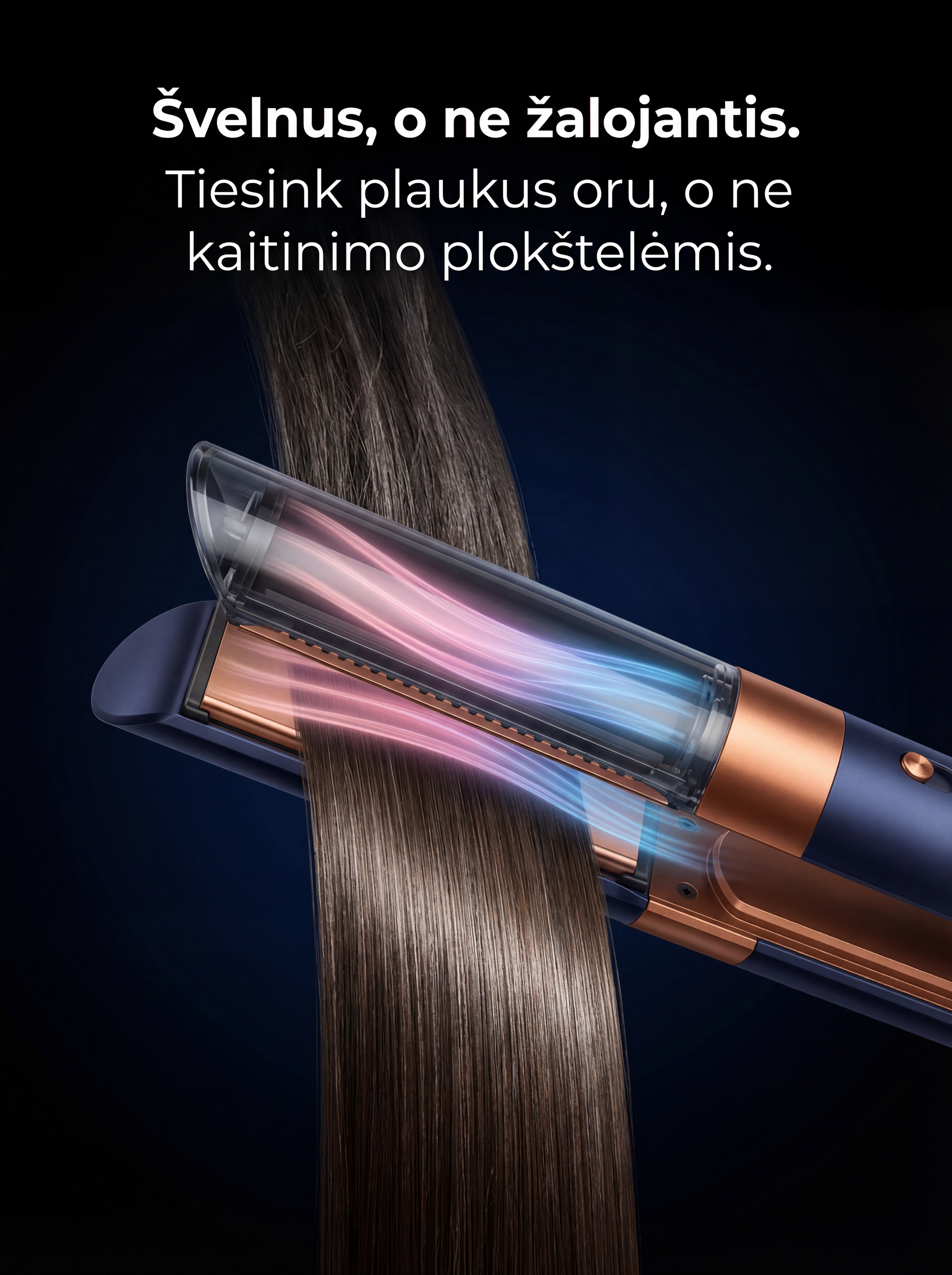 Mūsų Air Straightener sukurtas tam, kad kasdienis plaukų formavimas būtų greitesnis, švelnesnis ir saugesnis. Naudojame oro technologiją vietoje kaitinimo plokštelių, todėl plaukai išlieka švelnūs, glotnūs ir mažiau pažeidžiami net naudojant kasdien.